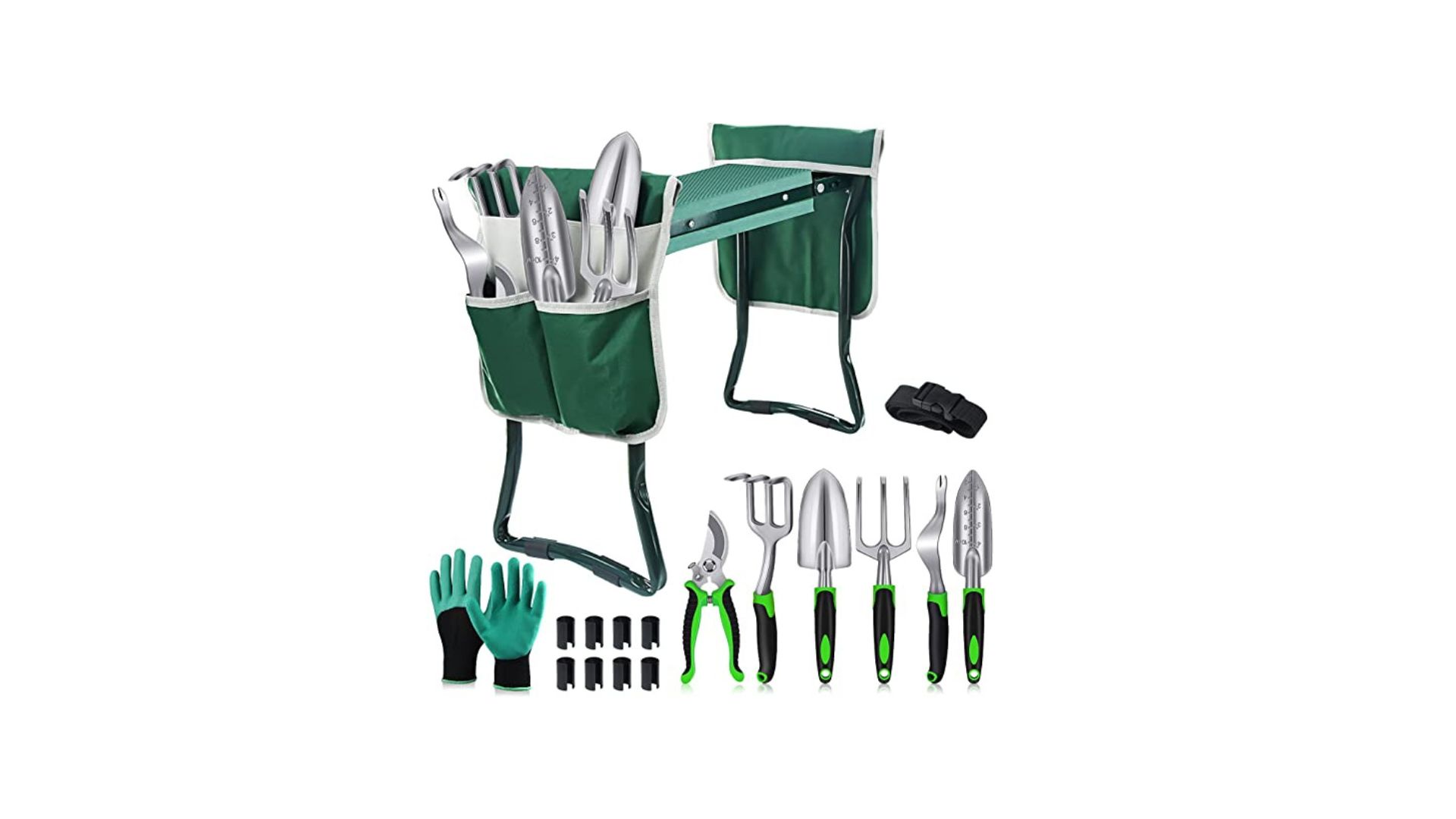 - Bonus Garden Tool Kit - Except for the kneeling garden stool, we also provide 6 high-quality aluminum gardening tools (including 2Pcs transplanter trowel, hand rake, weeder, pruner, cultivator), 2 large capacity tool pouches and a detachable belt, a pair of gardening digging gloves, 8 detachable foot pad protective covers. Meet your gardening activity need and no additional purchase of auxiliary tools.